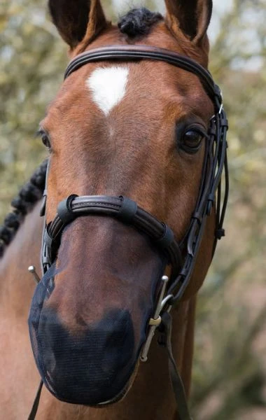 One of the most effective products in controlling the symptoms of headshaking. Unlike traditional nose nets that cover the whole muzzle, its contoured, shaped design covers only the top half of the muzzle. Attaches easily to a noseband and once in place, the nose net is unobtrusive, allows saliva to escape from the mouth freely and does not interfere with the horse’s breathing. Improved the symptoms of 79% of headshaking sufferers in clinical trials at De Montfort University. Totally unobtrusive and permitted by British Dressage and British Eventing for use in competition (see rule applying to the use of nose nets for each organisation).