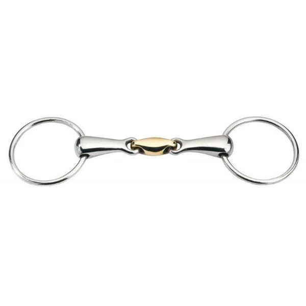 Stainless steel. Thick double-jointed mouthpiece with anatomic cyprium link.