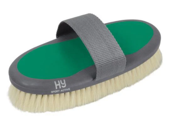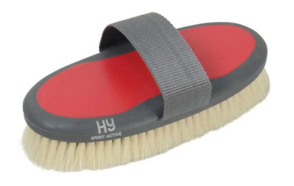 Two tone, soft touch large oval body brush with goat hair bristles.