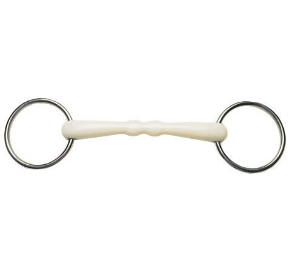 The Korsteel JP Flexi Bits are made from hi-tech plastic which has been moulded around a core of stainless steel, so the durability of the bit is not compromised. The flexi mouthpiece is ‘warmer’ than a traditional stainless steel mouthpiece, which encourages acceptance of the bit. For this reason, the flexi mouthpiece is a good choice for younger horses and those with a sensitive mouth.