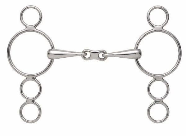 The French link in this bit means pressure is applied to both sides of the tongue. Some horses with low palates may find this bit more comfortable as the mouthpiece should not come into contact with the palate when the bit is in action. The three rings offer leverage options to increase severity.