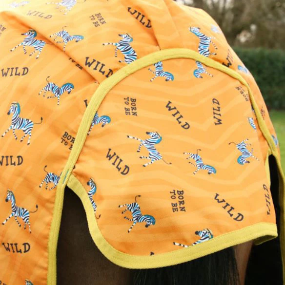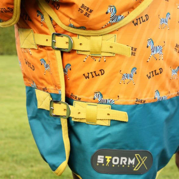 Born to be wild! This fun rug from the StormX collection features the brand new zebra print – with zebra striped background, ‘Born to be Wild’ slogan and zebra characters! This 200g fill rug is made from a 600 denier ripstop, waterproof material, with integrated contour neck cover for extra protection that is fastened with touch tape fastenings. Featuring twin buckle chest fastenings, adjustable cross surcingles and adjustable leg straps to keep the rug securely in place.