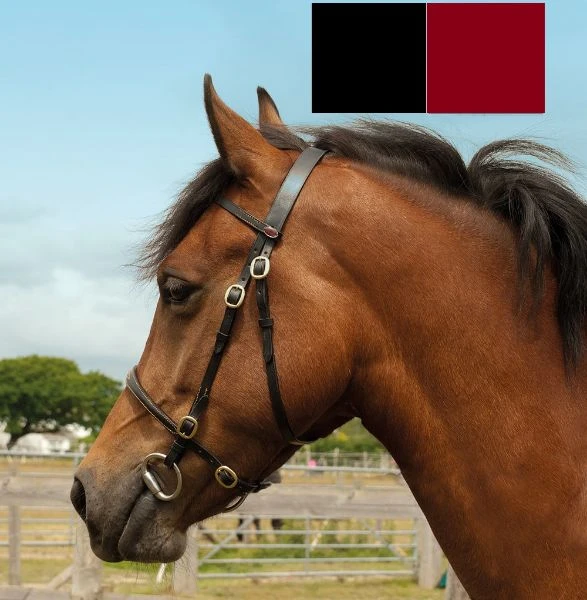 Economy leather in-hand bridle with fancy stitching on the noseband with brass buckles.